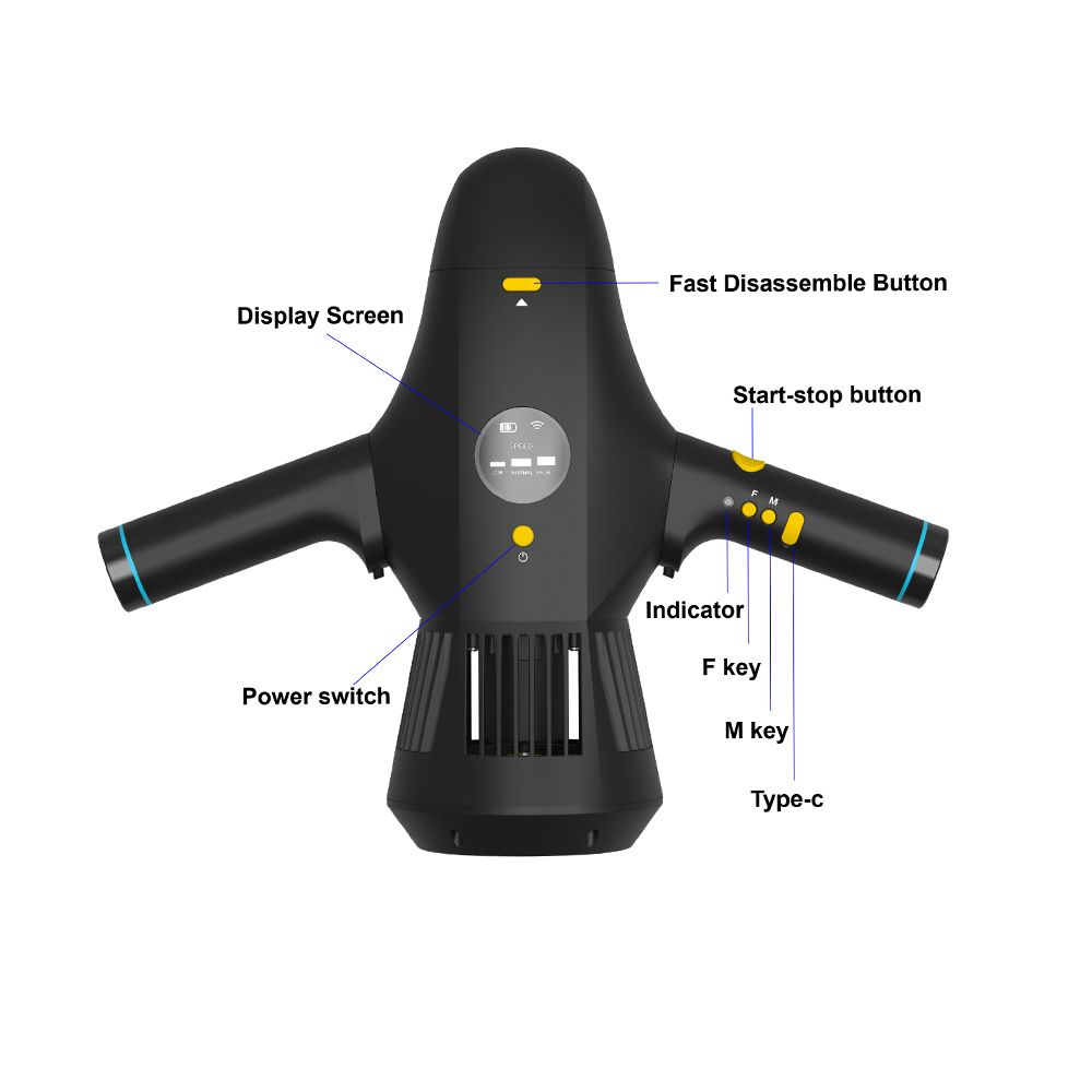 Incluye en el paquete: 1 scooter acuático, mandos, soporte de surf y cámara, sistema de carga, batería, cuerda de ajuste y manual.